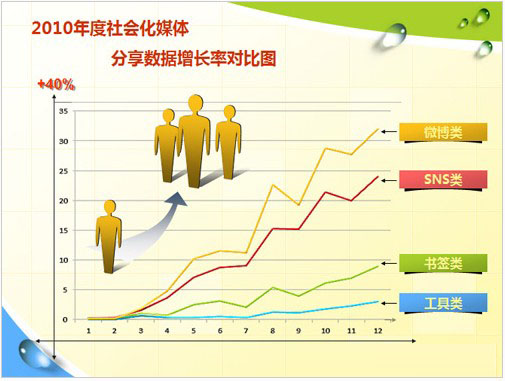 將2010年各類型媒體每月分享數(shù)據(jù)匯總,我們發(fā)現(xiàn)微博類發(fā)展迅猛,增速排名第一。