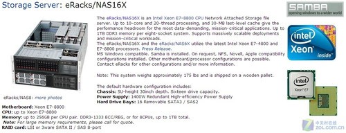 據國外媒體PRWeb最新報道,美國西部時間7月5日,PC廠商eRacks Open Source Systems宣布推出采用最新至強處理器的兩款NAS系列服務器,它們分別是eRacks/NAS6X和eRacks/NAS16X。這兩款產品主要針對大規模部署和關鍵業務應用。這兩款產品最多可以支持4個或者8個CPU,每個處理器支持最高10個內核和30MB的緩存。