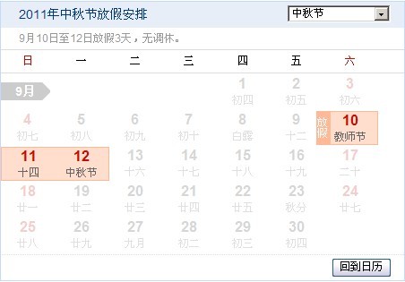 9月10日至12日放假3天,即周六、周日、周一,無調休。
