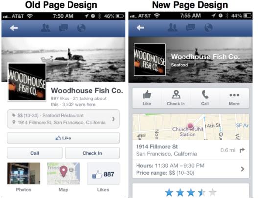 據(jù)美國科技博客TechCrunch報道,本周二,F(xiàn)acebook移動端品牌頁面(Pages)在改版后以全新姿態(tài)亮相,新版增加了本地商家的詳細資料、評級等功能,同時“贊”(Like)、“簽到”(Check-In)等按鈕的位置更靠前。