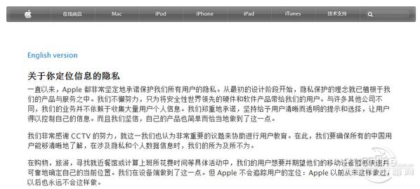 蘋果的聲明明確否認泄露用戶隱私,表明了iOS的定位功能是安全可靠的。“我們非常感謝CCTV的努力,就這一我們也認為非常重要的議題來協助進行用戶教育。在此,我們要確保所有的中國用戶能夠清晰地了解,在涉及隱私和個人數據信息時,我們的所為及所不為。”