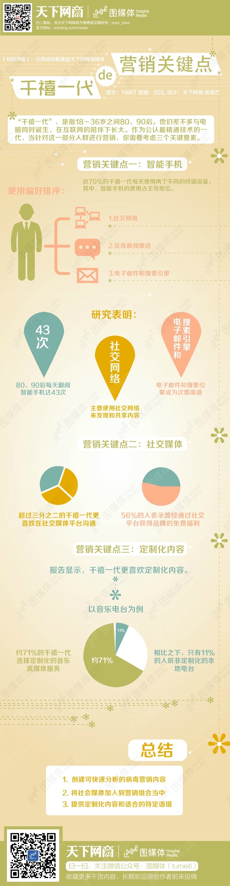 “千禧一代”是指18~36歲之間80、90后。他們差不多與電腦同時誕生,在互聯網的陪伴下長大。針對這一部分人群進行營銷,你需要考慮三個關鍵要素:智能手機、社交媒體和定制化內容。