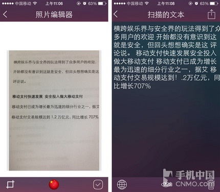 《光學(xué)字符識別》的使用方法非常簡單,只要對準(zhǔn)要編輯的文本拍下一張照片即可,別忘了選擇一下需要翻譯的語言,應(yīng)用會自動對圖片中的文本進(jìn)行識 別。小編測試了幾個不同字體不同材質(zhì)的圖片,白色打印紙黑色字體識別率最高,雜志印刷效果次之,而色彩差異比較大的廣告單頁則效果不太好。不過“翻譯”的 時間有點長,需要耐心等待一小會,但肯定比打字要來的快多了。