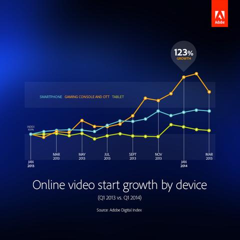 Gaffney說(shuō)雖然大部分的增長(zhǎng)都來(lái)自于游戲機(jī),但這個(gè)類別里還包括像Apple TV、Roku和Chromecast這樣的設(shè)備。Adobe表示,這個(gè)數(shù)字太小以至于不能單獨(dú)成一類別,我好奇的是如果他們持續(xù)增長(zhǎng),那么又將有多少數(shù)字是由附加設(shè)備貢獻(xiàn)的呢?