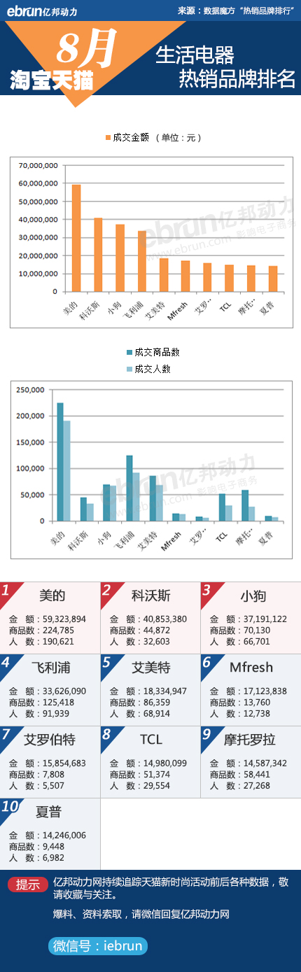 9月9日消息,億邦動力網(wǎng)根據(jù)數(shù)據(jù)魔方信息,匯總了8月份生活電器品類在淘寶和天貓平臺銷售排名前十品牌的銷售數(shù)據(jù)。美的在8月的銷售出現(xiàn)了大幅下滑,不過依舊以5932萬元的成交額排在榜首。