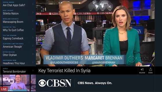 2014年底,CBSN首先在Xbox One提供,后來到達Amazon Fire TV,Android TV,Apple TV,Roku等平臺。這些平臺的共同特點就是類似國內(nèi)小米、樂視等盒子或互聯(lián)網(wǎng)電視機,存在繞過有線或無線電視網(wǎng)觀看視頻節(jié)目的方法,也就是所謂的OTT服務(wù)。除此之外,CBSN也可以在CBS新聞的官方網(wǎng)站、iOS和Android客戶端收看。