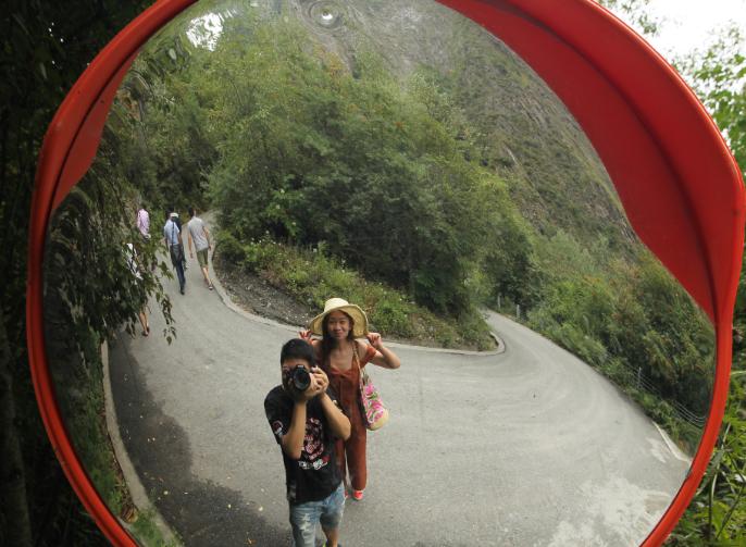 狹長(zhǎng)的墨海,在海邊完全看不出它的形狀,陽(yáng)光下的墨海,波光粼粼,靈氣逼人。站在邊上,極目遠(yuǎn)望,只見(jiàn)金色的陽(yáng)光灑滿水面,微風(fēng)拂過(guò),蕩起粼粼水花,四周山峰峭立、林木茂密,山、水、林在幽靜中組成了一幅淡雅的水墨畫(huà)。